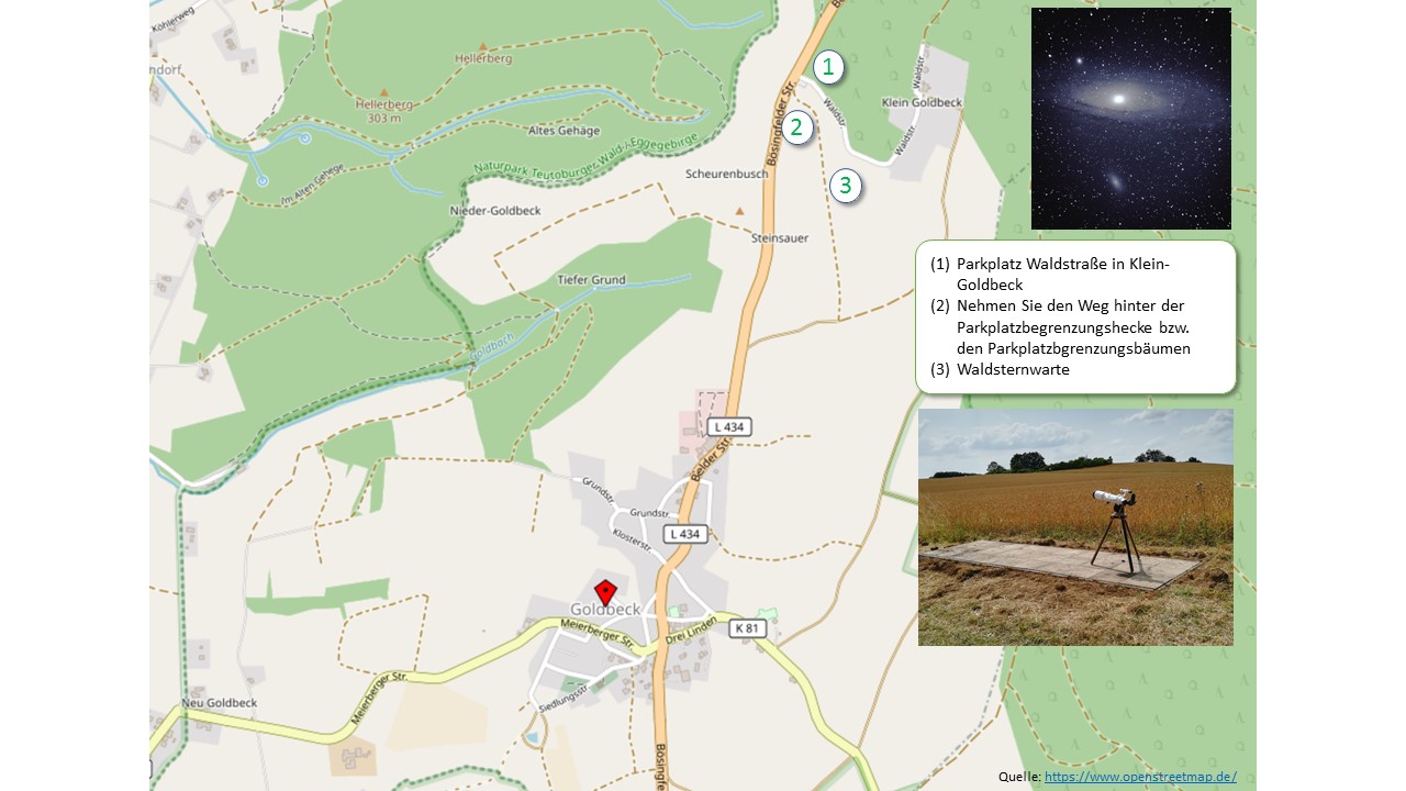Waldsternwarte Der Verein Waldkurort Goldbeck hat gemeinsam mit dem Rintelner Lehrer Sven Rundfeldt eine "Waldsternwarte" eingerichtet. Hierbei handelt es sich um eine befestigte Plattform am Waldrand vor Klein-Goldbeck. Die Plattform befindet sich dabei an einer Stelle, die aufgrund der Lage am Rande eines Waldgebietes in den Nachtstunden von einer sehr großen Dunkelheit gekennzeichnet ist. Es gibt keine störenden Beleuchtungen. Zudem bietet die Stelle einen freien Blick auf den Polarstern, was für die Ausrichtung von Teleskopen wichtig ist. Schon mit handelsüblichen Teleskopen können Hobby-Astronomen an dieser Stelle eine herausragend gute Sicht auf Planeten und Galaxien genießen. Alle abgebildeten Fotos sind Originalaufnahmen aus Klein-Goldbeck. Die Waldsternwarte liegt zudem in unmittelbarer Nähe zum höchsten Punkt des Kreises Schaumburg (378 Meter). Gemeinsam mit Sven Rundfeldt wird der Waldkurort Goldbeck in Zukunft von Zeit zu Zeit Infoabende vor Ort veranstalten, bei denen Interessierte selber den tollen Blick auf das Universum genießen können. Über die Termine wird auf dieser Homepage im Bereich "Events" informiert. Den Weg zur Waldsternwarte zeigt die Karte unten. | Impressionen |